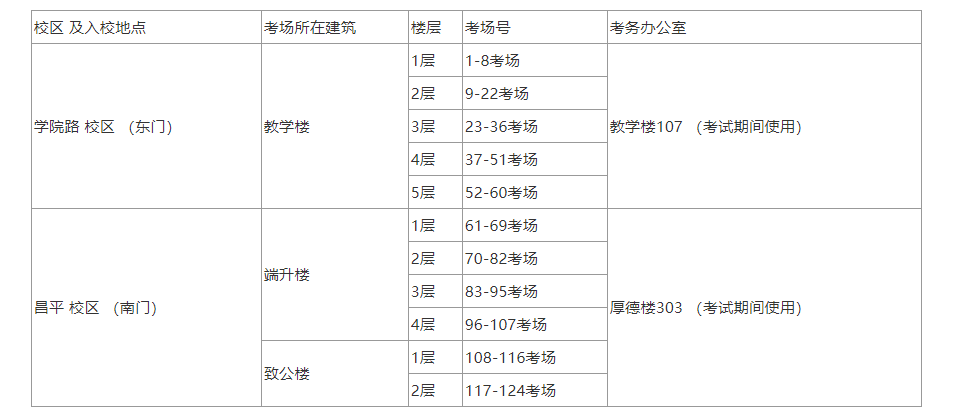 我考點(diǎn)考場分布在學(xué)院路校區(qū)教學(xué)樓及昌平校區(qū)端升樓、致公樓(具體分布見表1)。