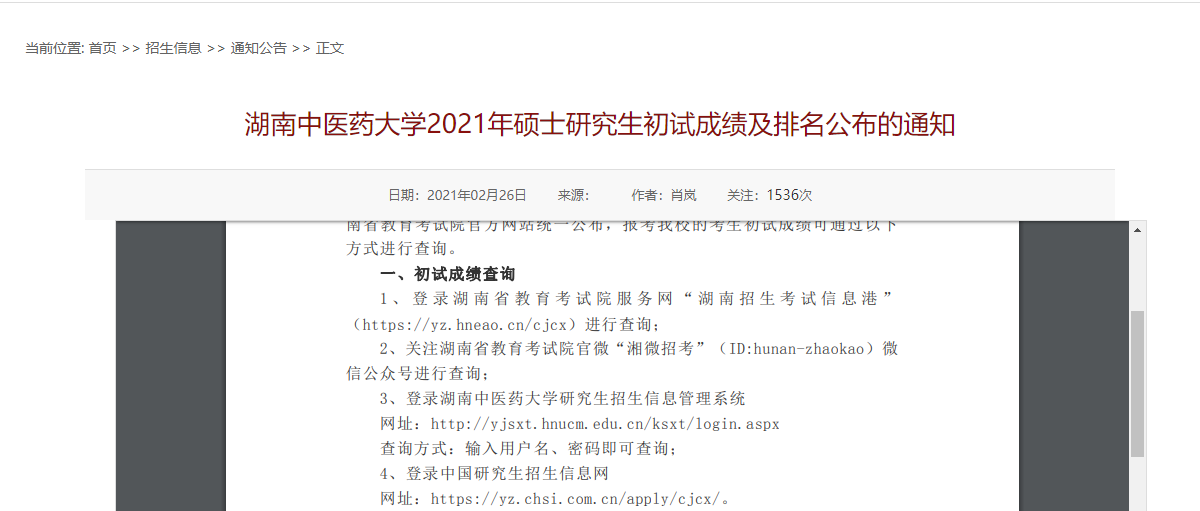 以上就是小編整理“2021考研初試成績:湖南中醫藥大學考研初試成績查詢入口開啟!初試成績已公布!”的全部內容,想了解更多相關信息請持續關注本網站。
