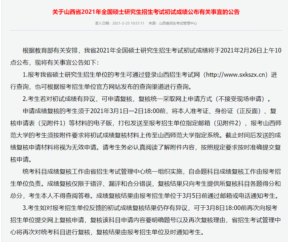 以上就是小編整理“2021考研初試成績:山西省2021年碩士研究生初試成績查詢通知”的全部內容,想了解更多相關信息請持續關注本網站。