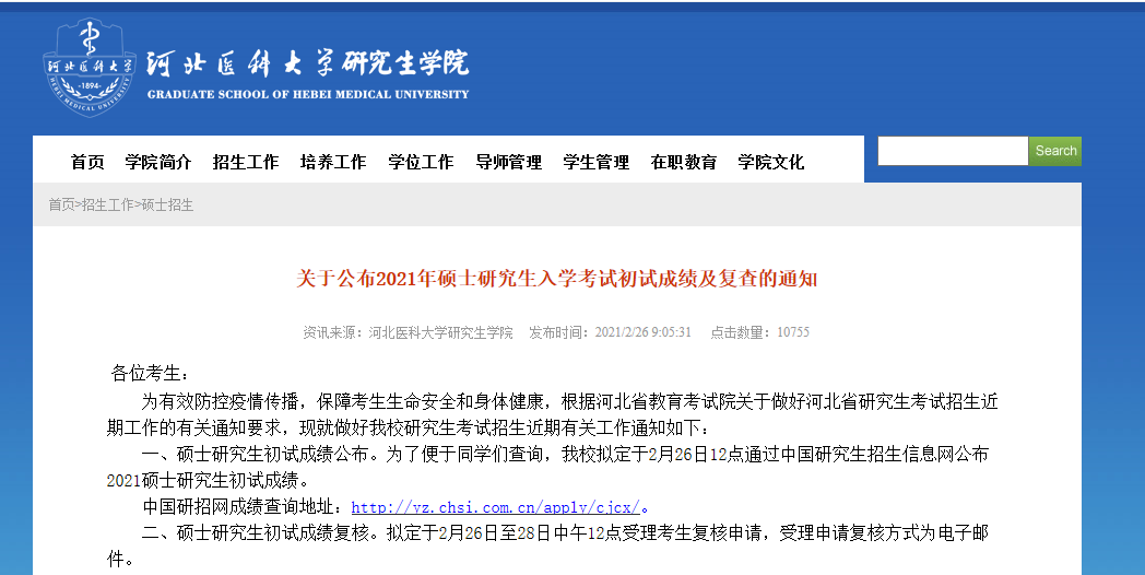 以上就是小編整理“2021考研初試成績:河北醫科大學考研初試成績查詢入口開啟!初試成績已公布!”的全部內容,想了解更多相關信息請持續關注本網站。