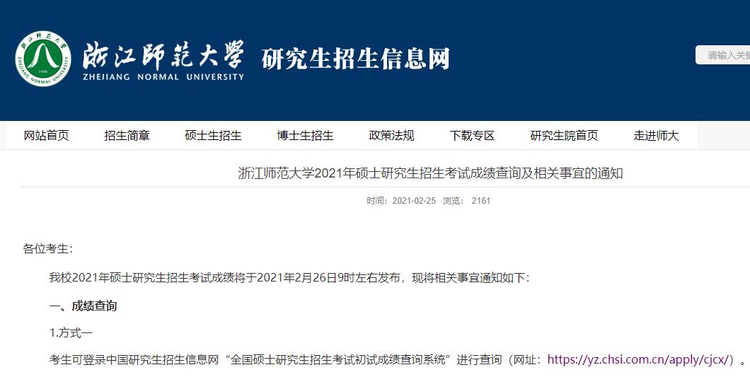 浙江師范大學考研初試成績查詢入口:http://yzw.zjnu.edu.cn/2021/0225/c4966a350400/page.htm