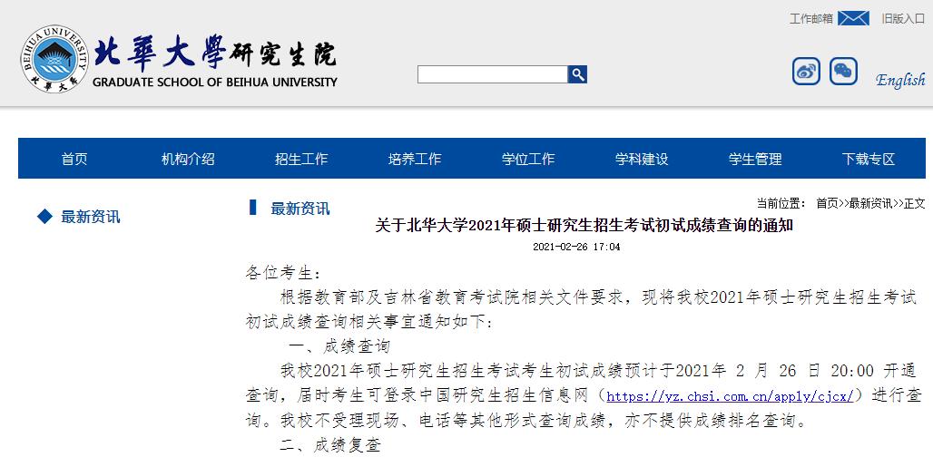 北華大學考研初試成績查詢入口:http://grad.beihua.edu.cn/info/1049/1843.htm