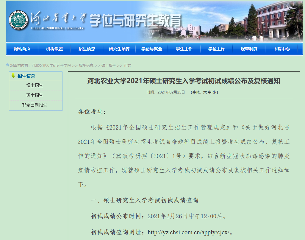 以上就是小編整理“2021考研初試成績:河北農業大學考研初試成績查詢入口開啟!初試成績已公布!”的全部內容,想了解更多相關信息請持續關注本網站。