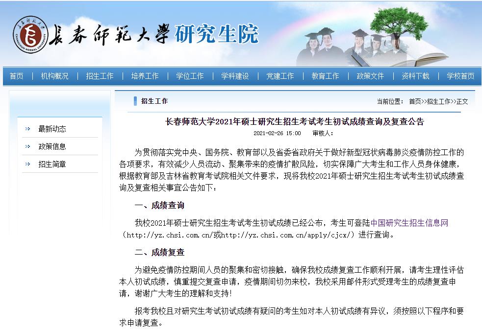 以上就是小編整理“2021考研初試成績:長春師范大學考研初試成績查詢?nèi)肟陂_啟!初試成績已公布!”的全部內(nèi)容,想了解更多相關(guān)信息請持續(xù)關(guān)注本網(wǎng)站。