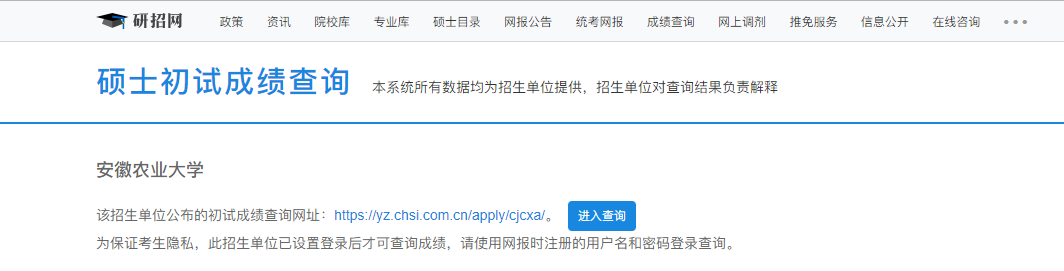 以上就是小編整理“2021考研初試成績:安徽農業大學考研初試成績查詢入口開啟!初試成績已公布!”的全部內容,想了解更多相關信息請持續關注本網站。