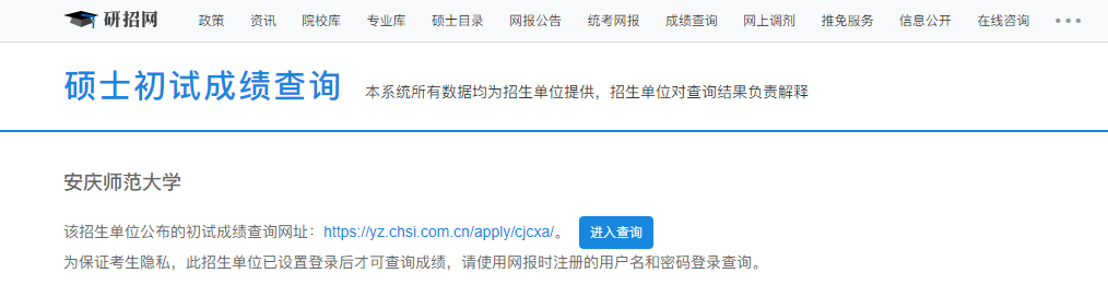 以上就是小編整理“2021考研初試成績:安慶師范大學考研初試成績查詢入口開啟!初試成績已公布!”的全部內容,想了解更多相關信息請持續關注本網站。