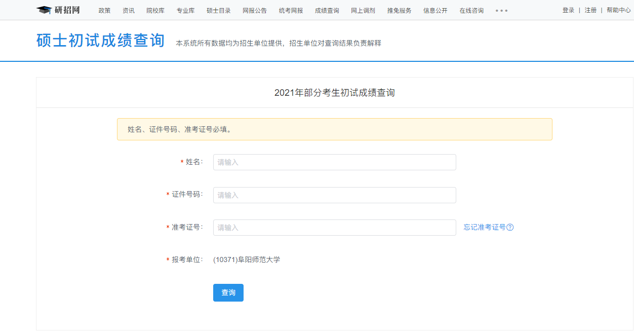 以上就是小編整理“2021考研初試成績:阜陽師范大學考研初試成績查詢入口開啟!初試成績已公布!”的全部內容,想了解更多相關信息請持續關注本網站。