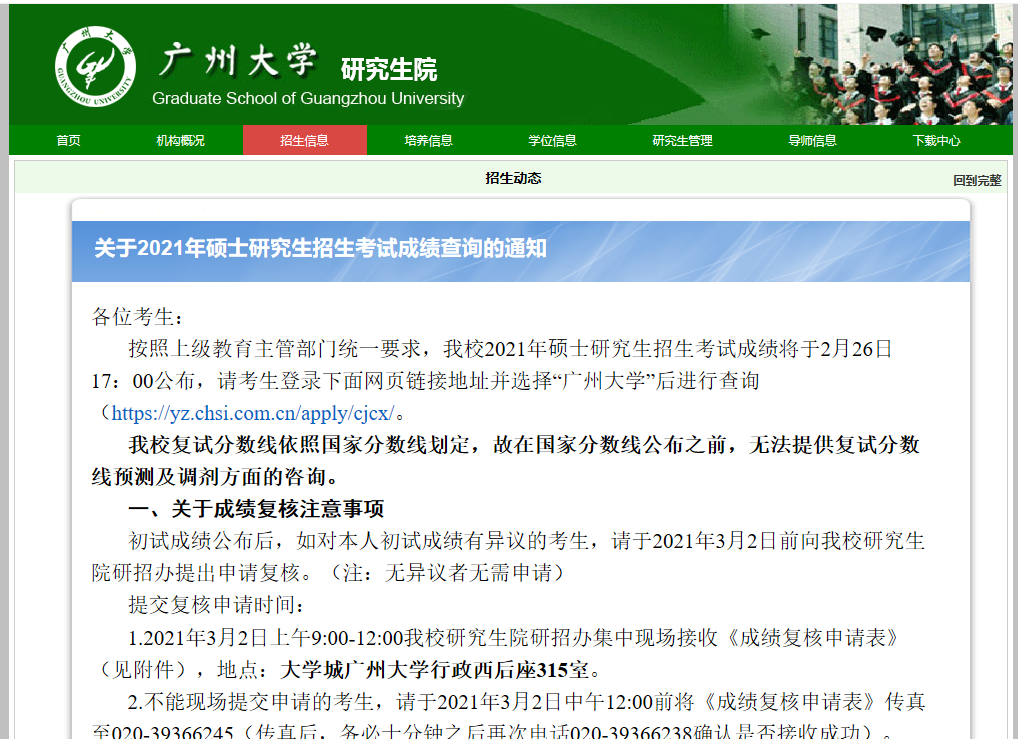 以上就是小編整理“2021考研初試成績:廣州大學考研初試成績查詢入口開啟!初試成績已公布!”的全部內容,想了解更多相關信息請持續關注本網站。