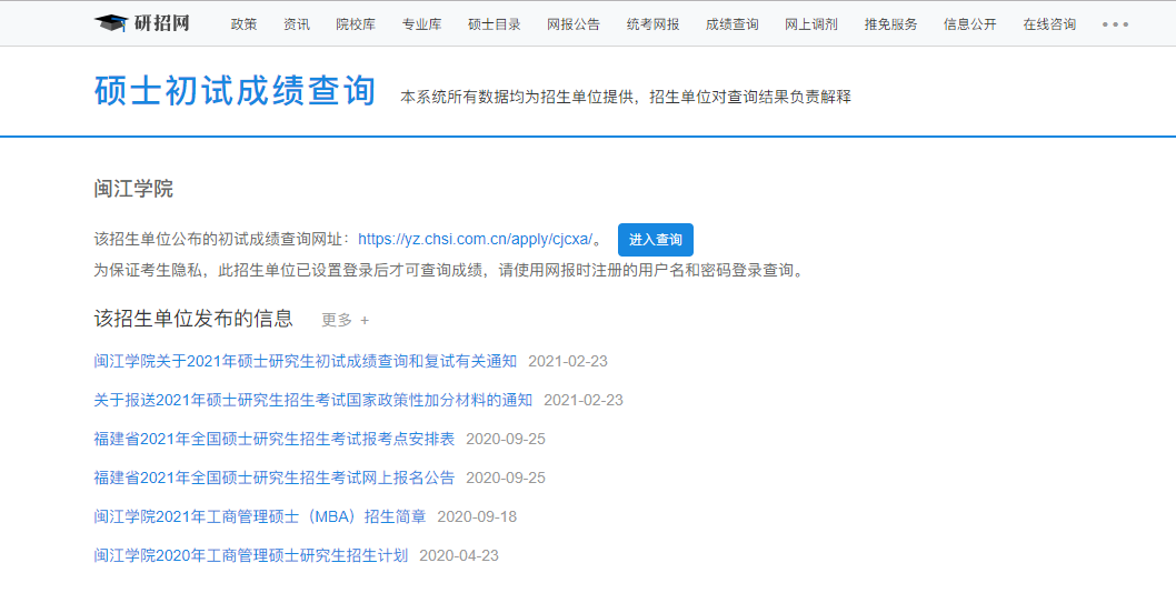 以上就是小編整理“2021考研初試成績:閩江學院考研初試成績查詢入口開啟!初試成績已公布!”的全部內容,想了解更多相關信息請持續關注本網站。