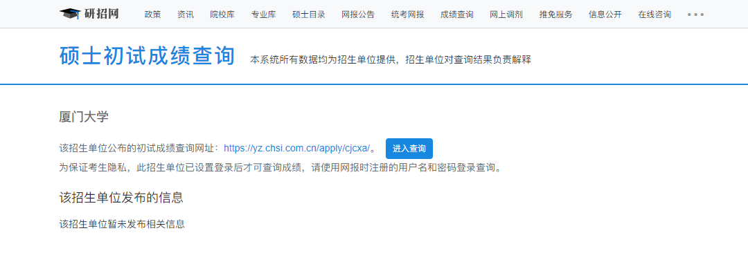 廈門大學考研初試成績查詢入口:https://yz.chsi.com.cn/apply/cjcx/sch/10384.dhtml