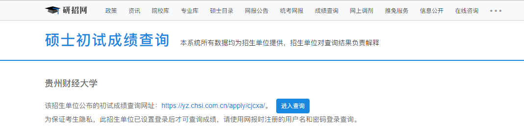 貴州財經(jīng)大學(xué)考研初試成績查詢?nèi)肟?/span>:https://yz.chsi.com.cn/apply/cjcx/sch/10671.dhtml