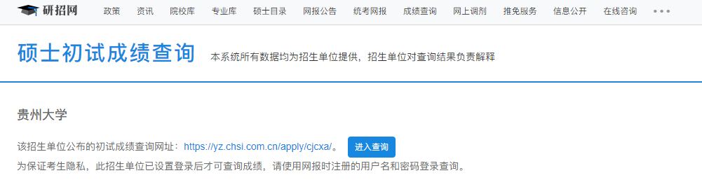 以上就是小編整理“2021考研初試成績:貴州大學(xué)考研初試成績查詢?nèi)肟陂_啟!初試成績已公布!”的全部內(nèi)容,想了解更多相關(guān)信息請持續(xù)關(guān)注本網(wǎng)站。
