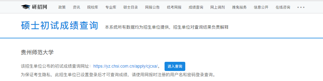 貴州師范大學考研初試成績查詢入口:https://yz.chsi.com.cn/apply/cjcx/sch/10663.dhtml