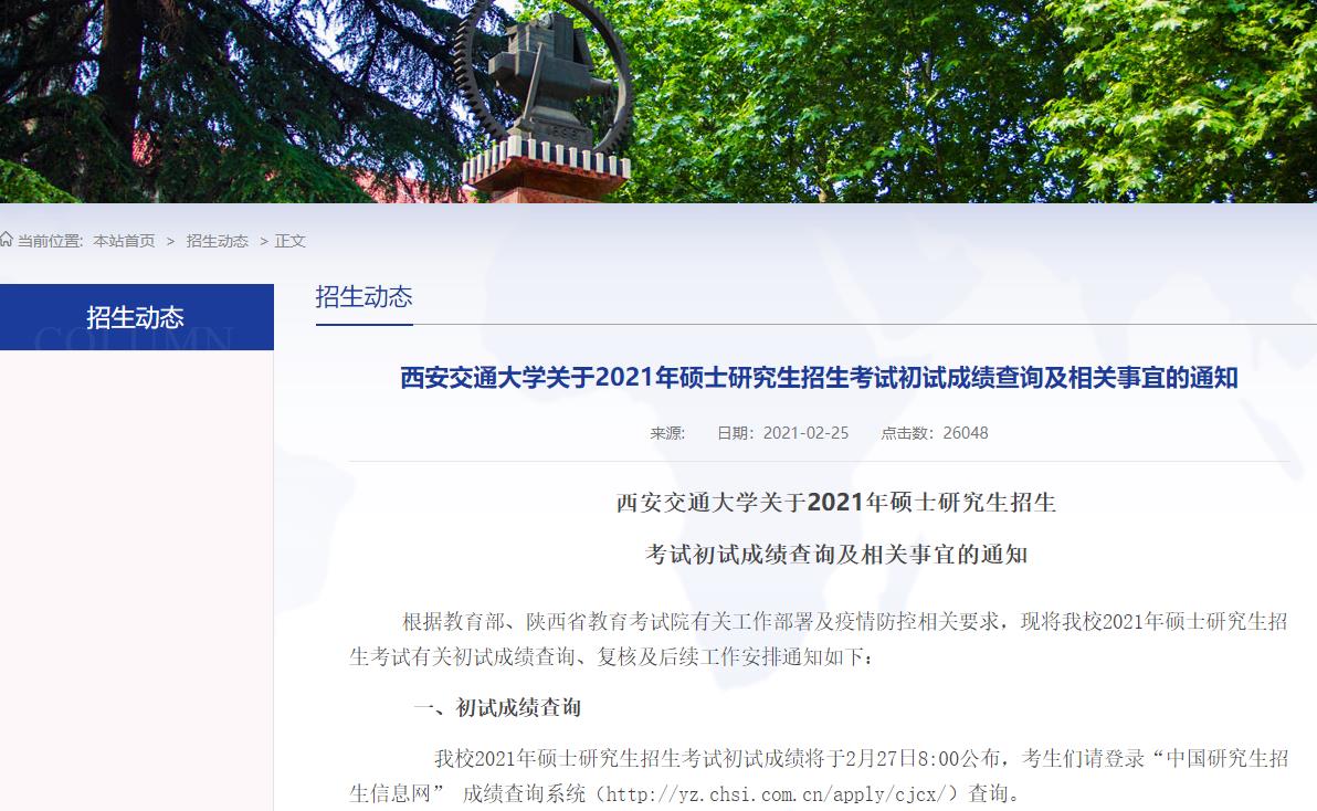 以上就是小編整理“2021考研初試成績:西安交通大學考研初試成績查詢入口開啟!初試成績已公布!”的全部內容,想了解更多相關信息請持續關注本網站。