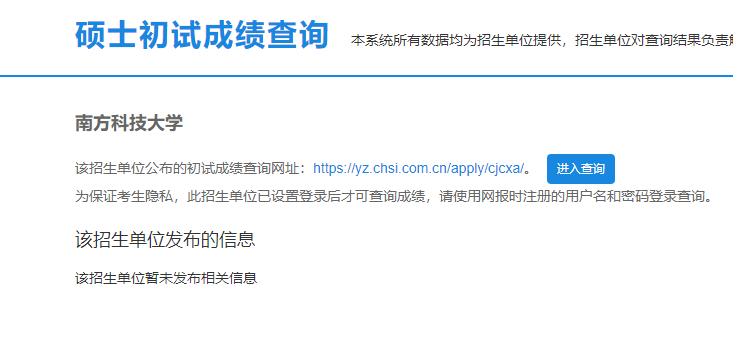 南方科技大學考研初試成績查詢入口:https://yz.chsi.com.cn/apply/cjcxa/