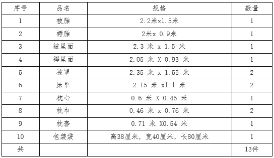 為確保學生身體健康和公共衛生安全,新生可自行攜帶臥具須確保質量。同時,學校為學生招標代購規格標準統一的臥具,合計價格以公示的中標價為準。具體包括: