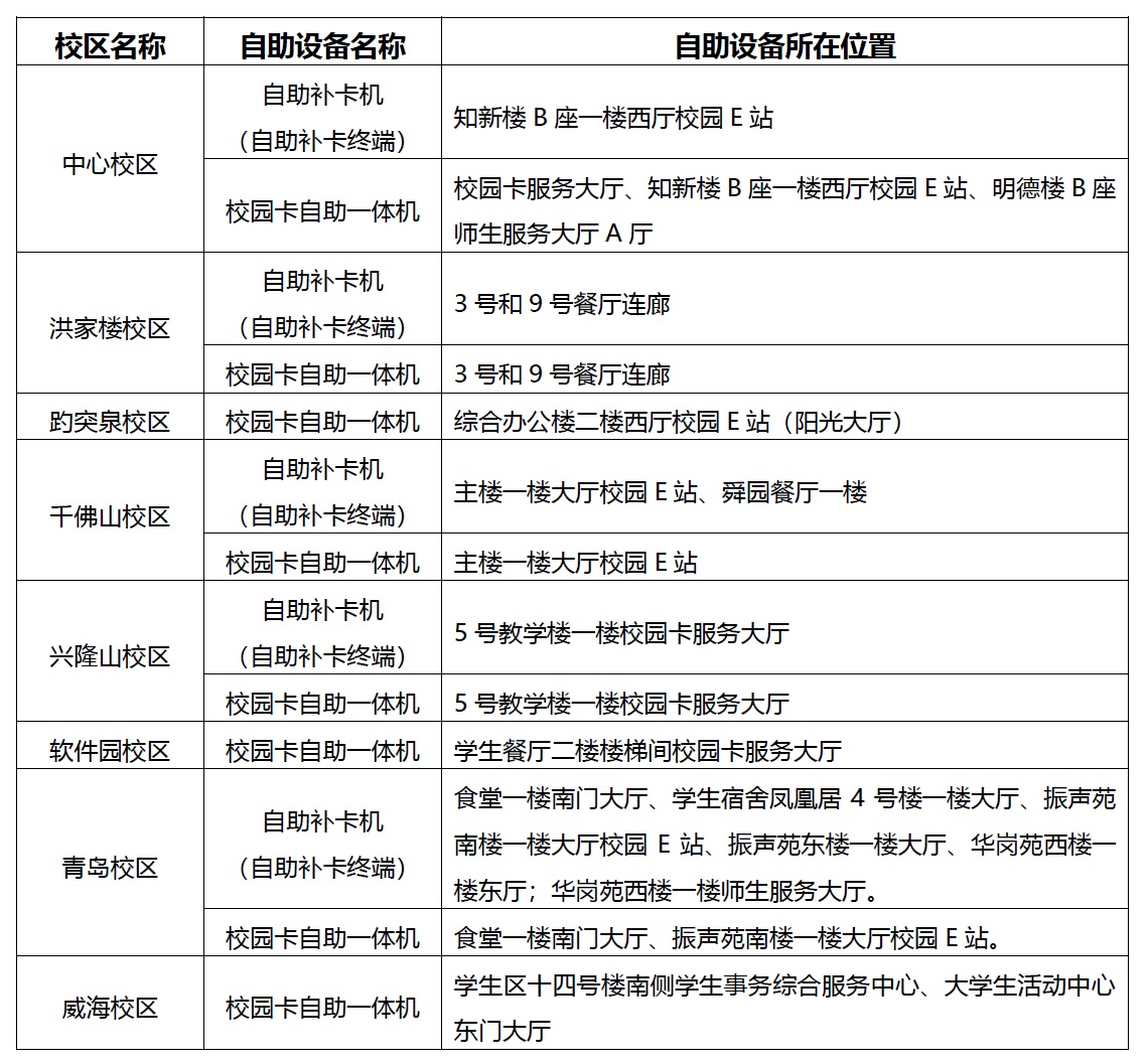 4.各校區自助補(領)卡機、校園卡一體機安裝位置如下: