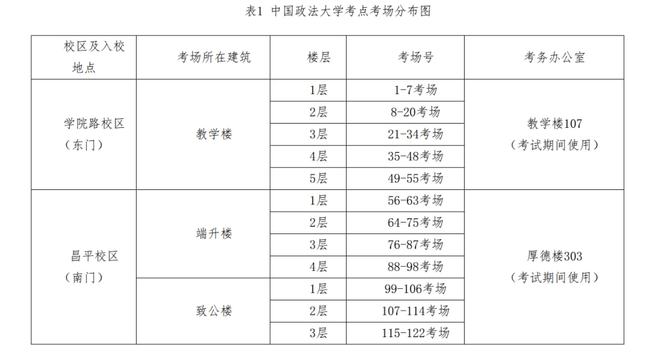 我校考點考場分布在學(xué)院路校區(qū)教學(xué)樓及昌平校區(qū)端升樓、致公樓(具體分布見表1)。