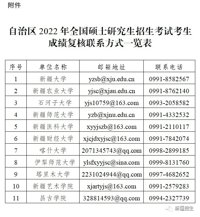 附件:自治區2022年全國碩士研究生招生考試考生成績復核聯系方式一覽表