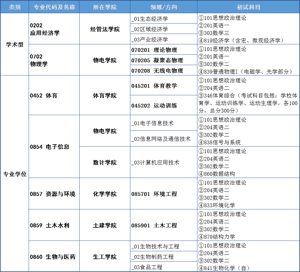 我校新增碩士學(xué)位授權(quán)一級學(xué)科2個,新增碩士專業(yè)授權(quán)點5個,相關(guān)專業(yè)信息及初試科目如下表,更具體的招生要求、專業(yè)目錄及參考書目、聯(lián)系方式詳見我校2023年碩士研究生招生簡章。