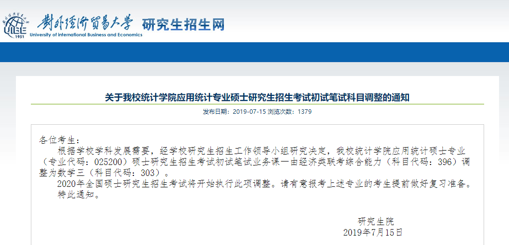 對外經貿大學統計學院應用統計專業碩士研究生招生考試初試筆試科目調整的通知