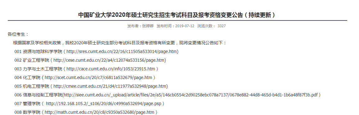 以上就是“中國礦業(yè)大學(xué)2020年碩士研究生招生考試科目及報考資格變更公告(持續(xù)更新)”全部內(nèi)容!更多院校考試科目更改內(nèi)容,點擊進入“院校公告”欄目查看!