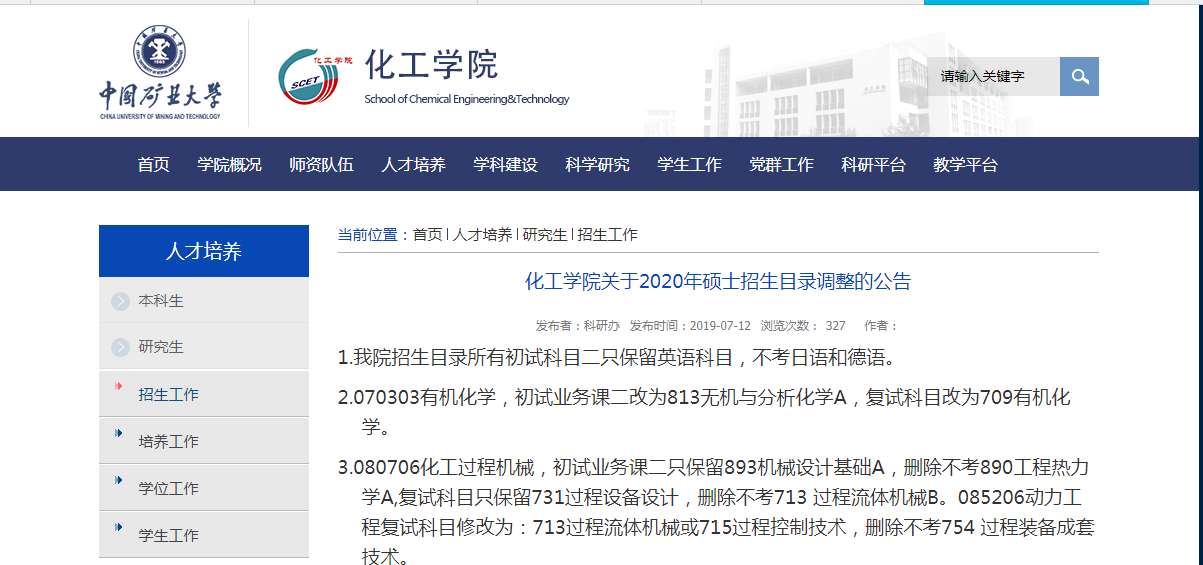 以上就是“中國(guó)礦業(yè)大學(xué)化工學(xué)院關(guān)于2020年碩士招生目錄調(diào)整的公告”的全部?jī)?nèi)容!更多院校考試科目更改內(nèi)容,點(diǎn)擊進(jìn)入“院校公告”欄目查看!