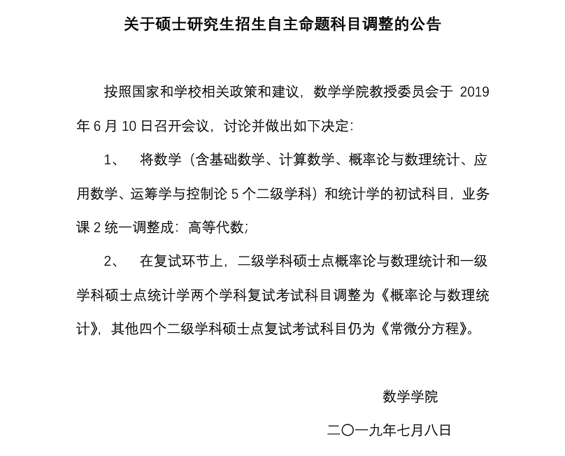 以上就是“中國礦業大學數學學院關于碩士研究生招生自主命題科目調整的公告”的全部內容!更多院校考試科目更改內容,點擊進入“院校公告”欄目查看!