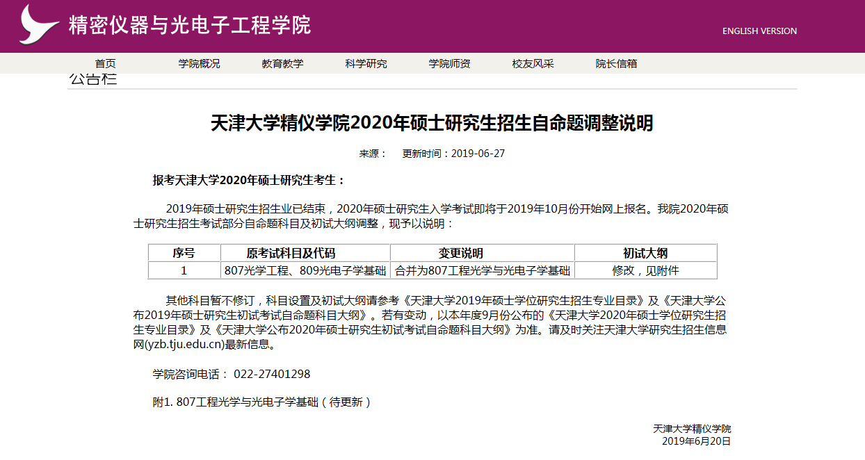 2019年碩士研究生招生業(yè)已結(jié)束,2020年碩士研究生入學(xué)考試即將于2019年10月份開始網(wǎng)上報(bào)名。我院2020年碩士研究生招生考試部分自命題科目及初試大綱調(diào)整,現(xiàn)予以說明: