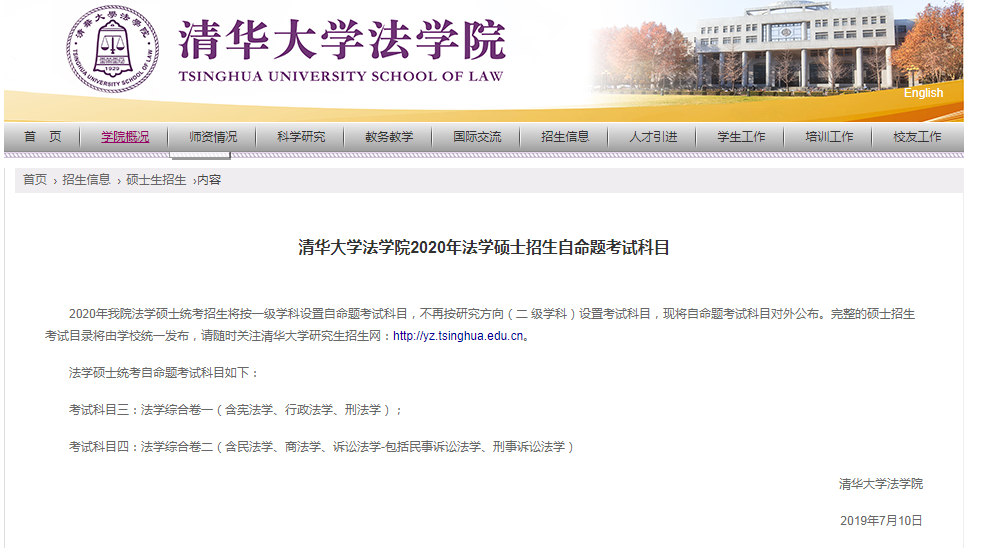 以上就是“清華大學法學院2020年法學碩士招生自命題考試科目”的全部內容!更多院校公告內容,盡在“院校公告”欄目!