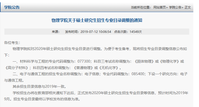 物理學(xué)院擬對2020年碩士研究生招生專業(yè)目錄進(jìn)行調(diào)整。為便于考生備考,現(xiàn)將招生專業(yè)目錄調(diào)整信息公布如下: