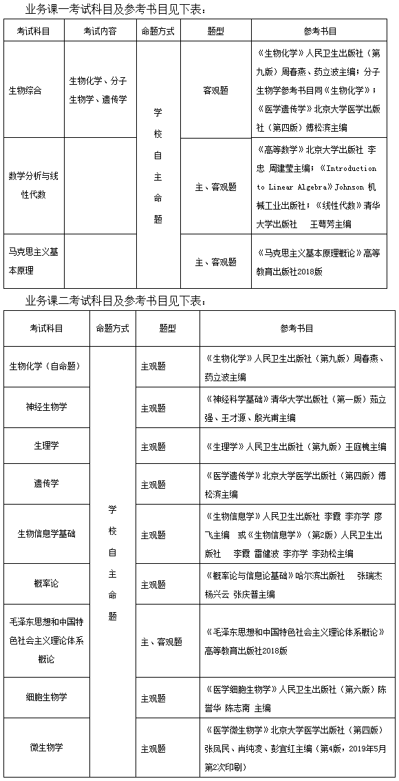 ③理學門類中生物學一級學科所涵蓋的所有二級學科(生理學、微生物學、神經生物學、遺傳學、發育生物學、細胞生物學、生物化學與分子生物學、生物物理學)、生物醫學工程一級學科、工程碩士(生物醫學工程)和法學門類的思想政治教育專業,初試科目仍為四門,第三門為業務課一考試科目(150分),第四門為業務課二考試科目(150分)。