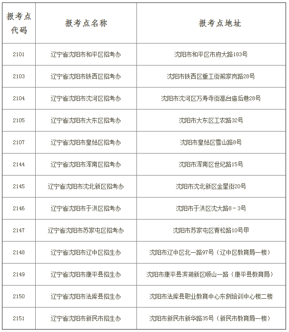 所有考生均須在沈陽市參加考試,務請考生在網報時,選擇沈陽市內各報考點之一辦理網上報名和現場確認手續(和平區、鐵西區、沈河區、大東區、皇姑區、渾南區、沈北新區、于洪區、蘇家屯區、遼中區、康平縣、法庫縣、新民市),在其他報考點報名無效。