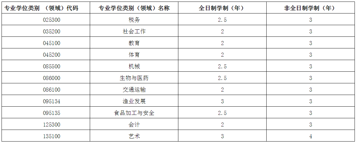 2.全日制專業(yè)學位碩士研究生學制按照下表執(zhí)行。