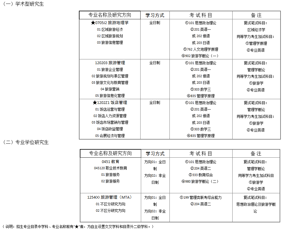 我院2021年招收的碩士研究生按學習方式分為全日制碩士研究生和非全日制碩士研究生兩種,其中全日制碩士研究生分為學術型碩士研究生和專業學位碩士研究生兩大類,全日制學術型碩士研究生專業有旅游地理學(0705J2 )、旅游管理(120203)和飯店管理(1202Z1),全日制專業學位碩士研究生招生專業有職業技術教育(045120)和旅游管理(1254),非全日制碩士研究生僅在專業學位旅游管理(125400)和職業技術教育(045120)兩個專業學位中招生。招生人數將按照湖南師范大學研究生院下達的計劃執行,旅游地理學專業不接受推免生,旅游管理、飯店管理、職業技術教育專業接受推免生。