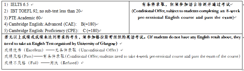 南開大學-格拉斯哥大學聯合研究生院各專業復試由相關學院組織,南開大學與格拉斯哥大學教授共同參與。通過該復試的考生,同時須滿足格拉斯哥大學語言條件,將被該專業錄取。格拉斯哥大學語言要求如下: