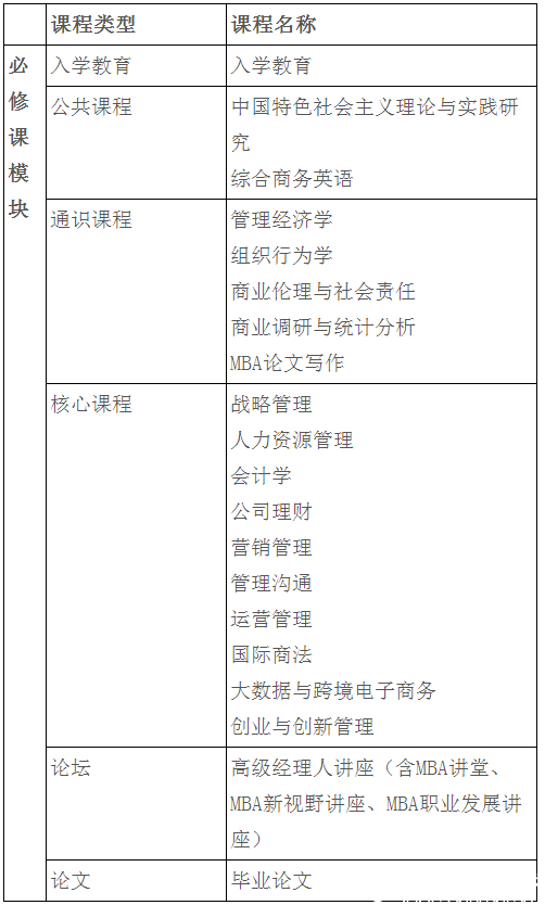 課程分為必修課及選修課兩大類:必修課包括5大模塊(公共課程模塊、通識課程模塊、核心課程模塊、論壇模塊),選修課包括“財務管理模塊、人力資源管理模塊、營銷管理模塊、運營管理模塊、“一帶一路”模塊、實驗實踐教學模塊”