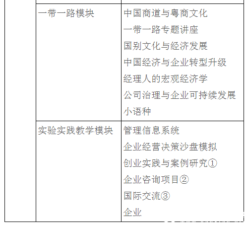 開設國際通用的MBA核心課程,讓學生直接掌握國際前沿管理理念和本土企業發展趨勢,開設《戰略管理》、《人力資源管理》、《營銷管理》、《運營管理》、《財務管理》、《國際商法》、《管理溝通》、《會計學》等重要課程;順應國際市場變化,開設《大數據與跨境電子商務》、《國際金融管理》、《品牌管理與營銷策劃》、《全球供應鏈管理》、《國際采購》、《中國商道與粵商文化》、《公司治理與可持續發展》、《小語種》等特色選修課程。