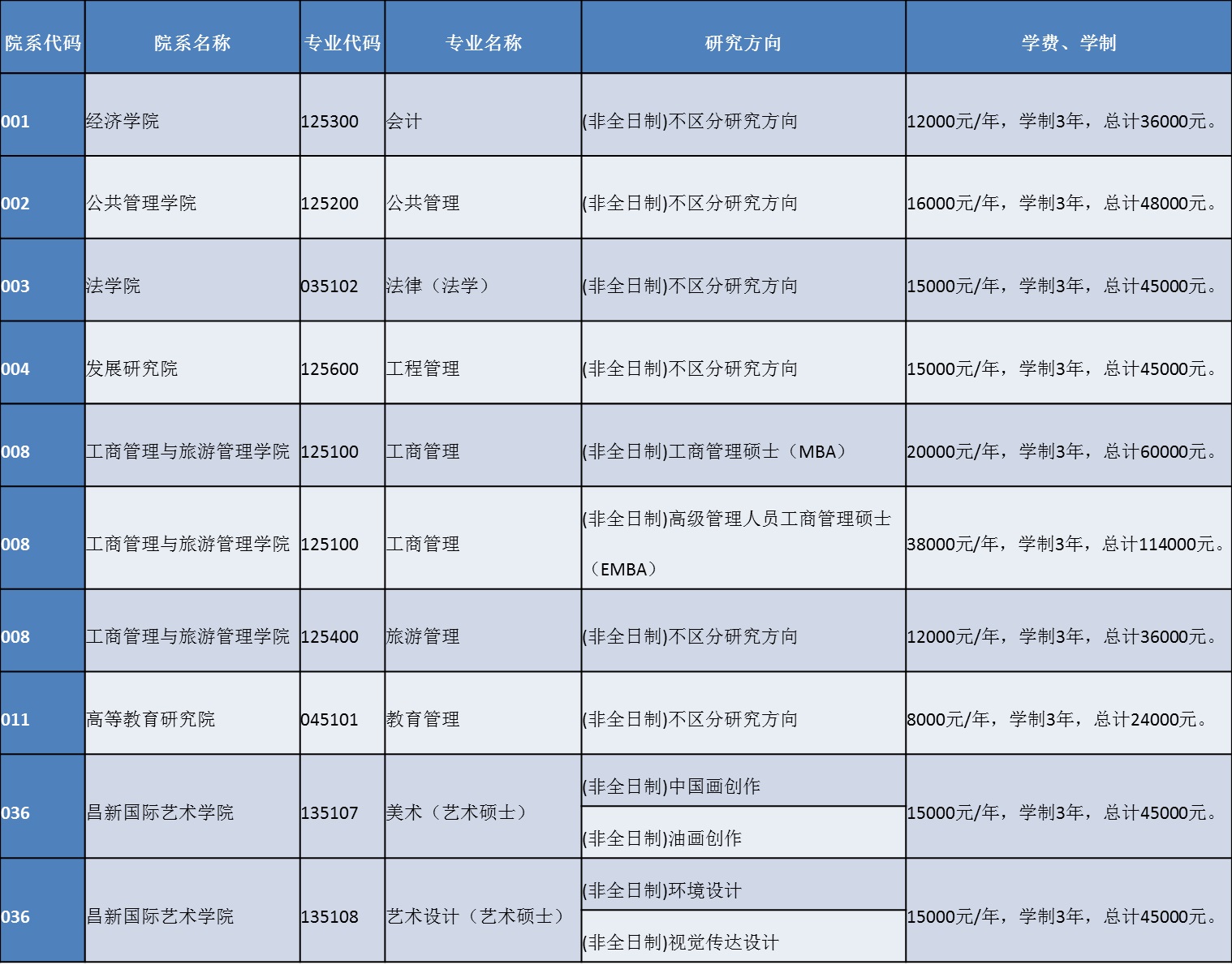 3. 非全日制碩士研究生學費見下表,具體以省級價格主管部門核定為準: