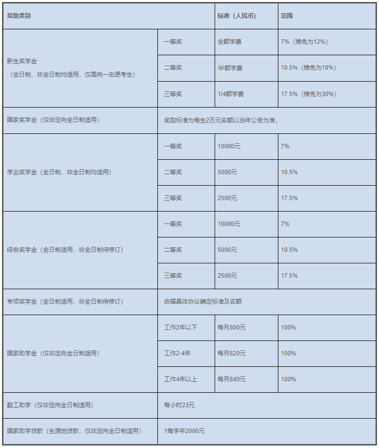 碩士研究生獎助體系基本情況如下表所示,具體以研究生部官網公告為準。