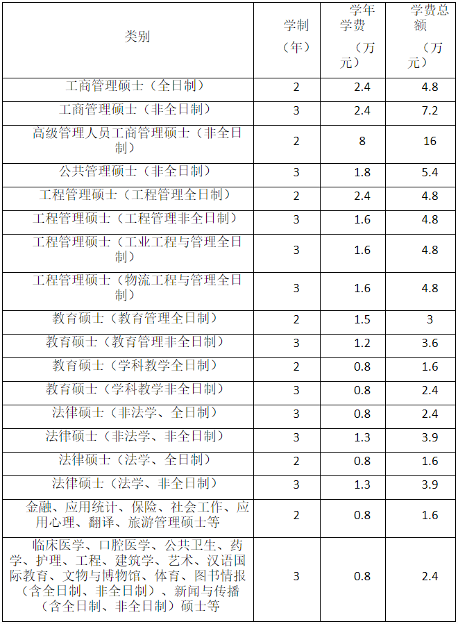 (二)學費:所有碩士研究生均按學制年限分學年收費。學術學位碩士研究生每生0.8萬元/學年;專業學位碩士研究生學制及學費標準見下表: