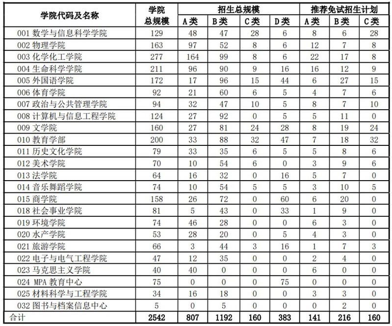 為了分類管理招生計劃,我校將研究生招生分為四類,即全日制學術學位(A類)、全日制專業學位(B類)【不包含農村師資教育碩士計劃(以下簡稱碩師計劃)】、碩師計劃(C類)、非全日制專業學位(D類)。招生計劃按學院(部)分類別進行分配,而不細分到各專業(領域),復試錄取時根據國家下達計劃、合格生源、師資等情況由各學院(部)公布分專業(領域)招生計劃。各學院(部)擬招生計劃見表1,總規模中包括推薦免試招生計劃,推免錄取結束后(預計在2022年10月底前)在研究生院網站公布實際錄取名額。推薦免試中A類、B類為預計招生數,C類按所列計劃招生。