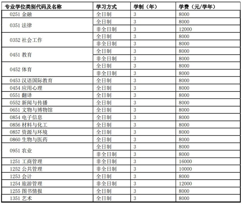 學術學位學習方式均為全日制,學制3年,每學年學費8000元。