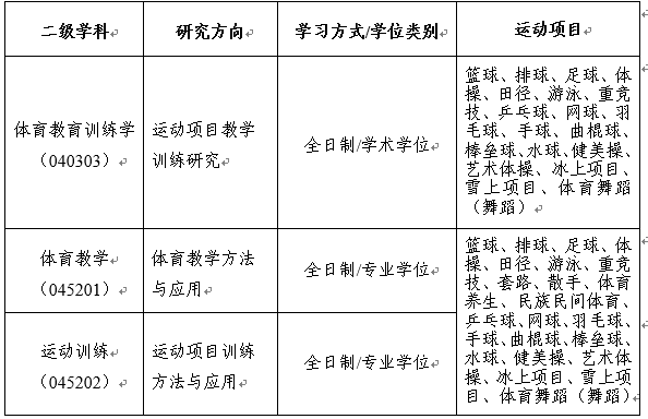 專業目錄中,有三個二級學科(含三個研究方向)中設有運動項目,在復試時測試專項技術(見表3),其他二級學科不設運動項目。