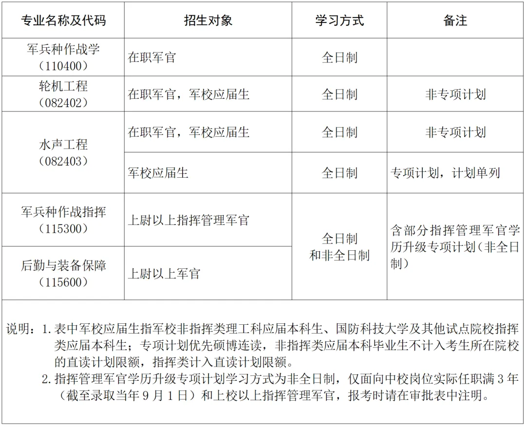 2. 專業(yè)學(xué)位(軍兵種作戰(zhàn)指揮、后勤與裝備保障)招收上尉以上軍官,其中專業(yè)技術(shù)軍官僅限報(bào)考后勤與裝備保障專業(yè)。專業(yè)學(xué)位部分非全日制指標(biāo)用于指揮管理軍官學(xué)歷升級(jí)專項(xiàng)計(jì)劃,僅面向中校崗位實(shí)際任職滿3年(截至2025年9月1日)和上校以上的指揮管理軍官,具體指標(biāo)請(qǐng)聯(lián)系學(xué)院招生辦。