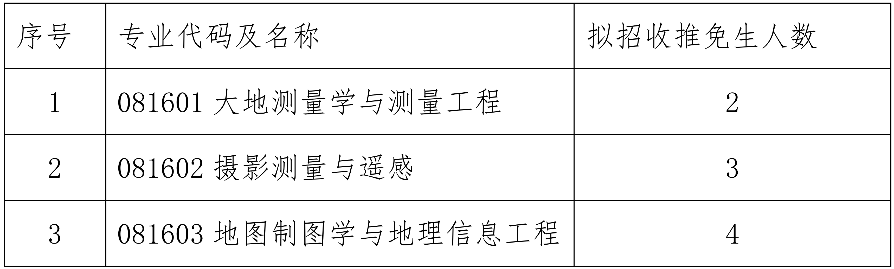 1、我院3個二級學科專業均接收推免生,分別為(081601)大地測量學與測量工程、(081602)攝影測量與遙感、(081603)地圖制圖學與地理信息工程。