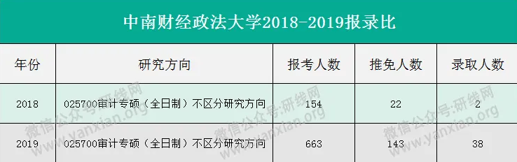 2020年的復試分數線和報錄比未確定,研線網整理了中南財經政法大學審計碩士2018-2019年的報錄比,供大家參考。