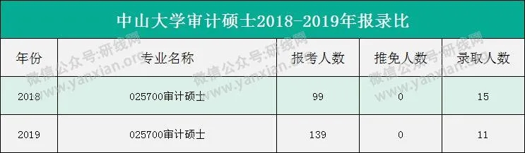2020年的復試分數線和報錄比未確定,研線網整理了中山大學審計碩士2018-2019年的報錄比,供大家參考。