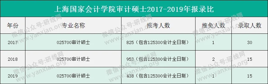 2020年的復試分數線和報錄比未確定,研線網整理了上海國家會計學院審計碩士2017-2019年的報錄比,供大家參考。