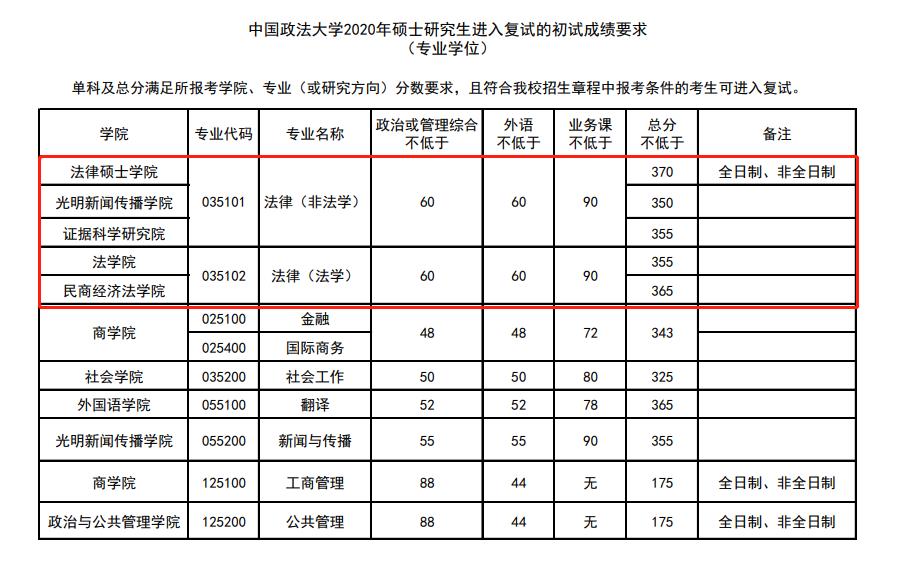 法侓碩士(非法學)法律碩士學院復試分數線:60/90/370